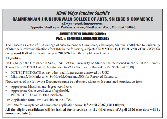 ADVERTISEMENT FOR ADMISSION TO PH. D. IN COMMERCE, HINDI AND ZOOLOGY for the second half of the academic year 2025-26