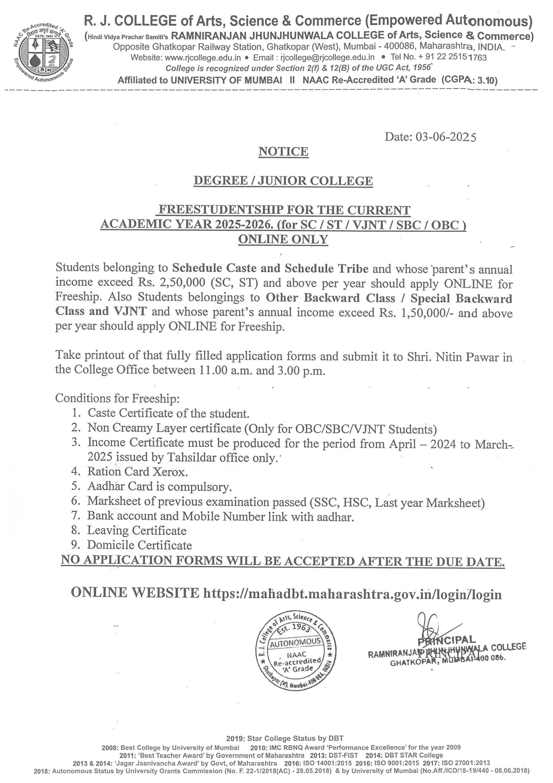 DEGREE / JUNIOR COLLEGE FREE STUDENTSHIP FOR THE CURRENT ACADEMIC YEAR 2025-2026. (for SC / ST / VJNT / SBC / OBC) ONLINE ONLY
