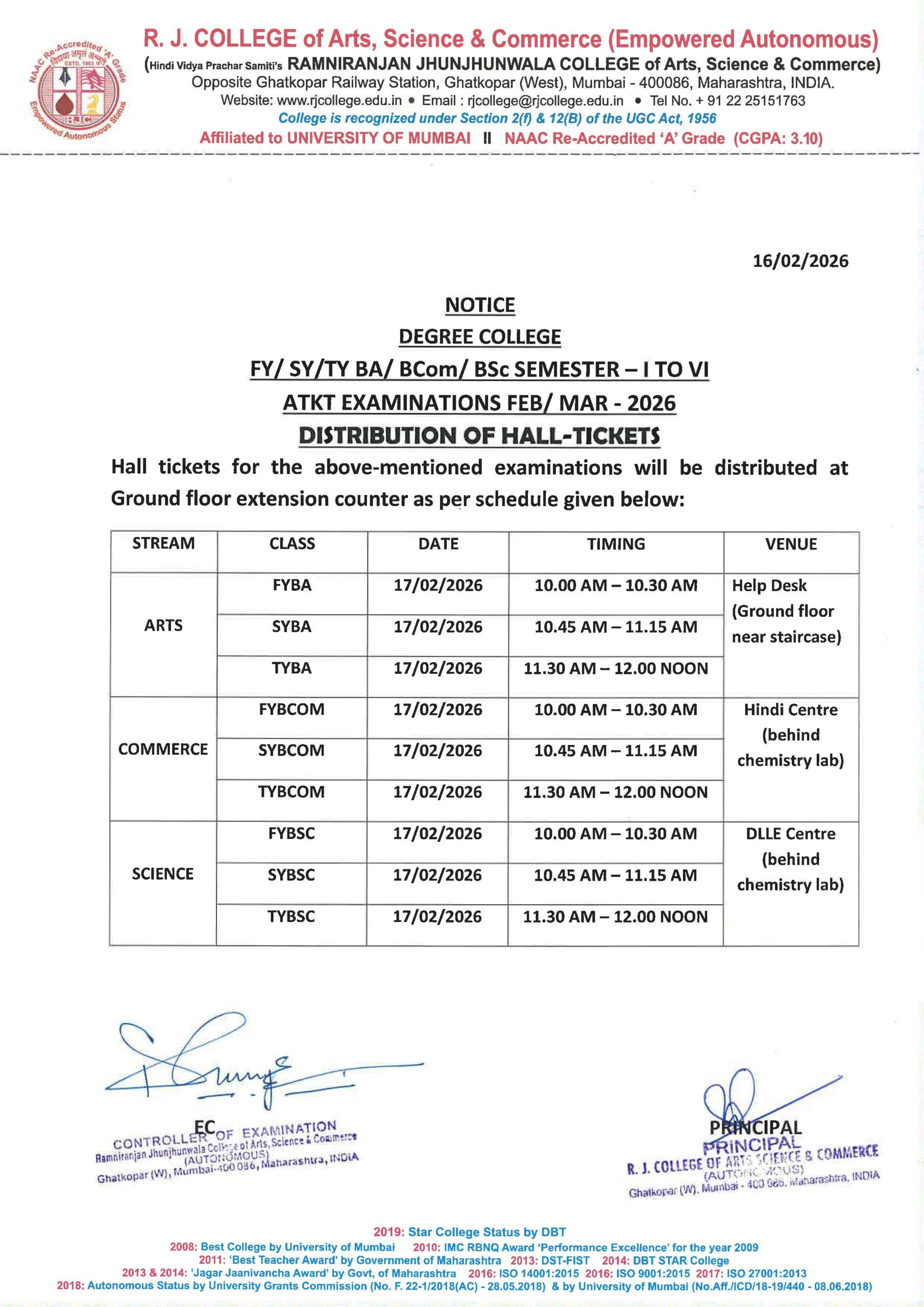 DISTRIBUTION OF HALL-TICKETS DEGREE COLLEGE FY/SY/TY BA/ BCom/ BSc SEMESTER – I TO VI ATKT EXAMINATIONS FEB/ MAR – 2026 Hall ticket ATKT distribution – FEB – 2026