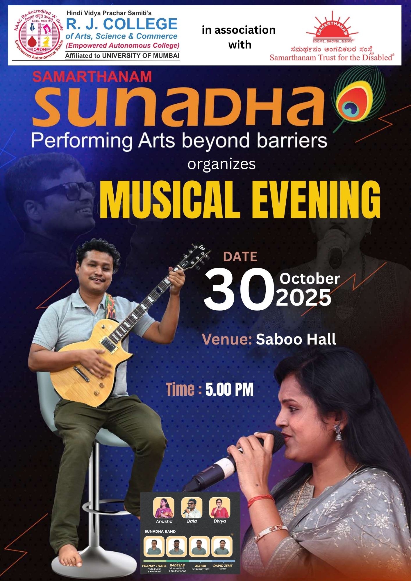 Featured Featured October 30 @ 5:00 pm - 6:30 pm Experience the Magic of Music Beyond Sight – Musical Evening on 30 Oct 2025 @ 5.00 Pm in Saboo Hall R J College