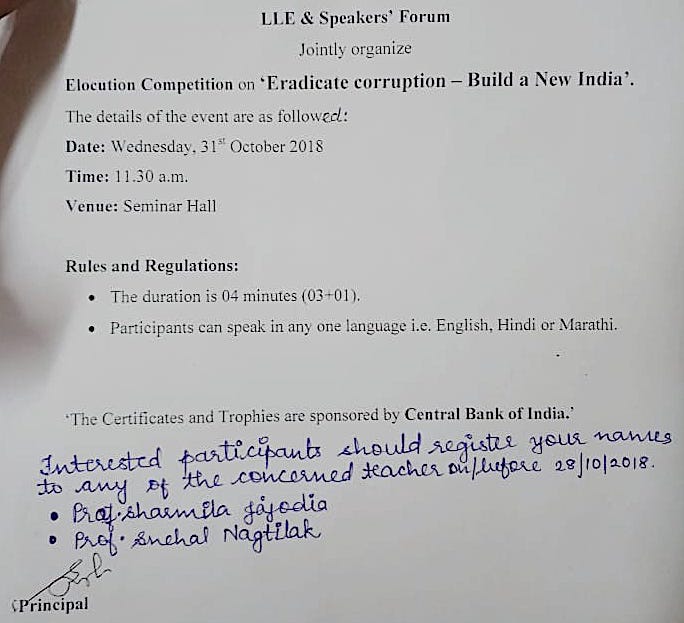 Elocution Competition on “Eradicate Corruption – Build a New India” (31st Oct, 2018)