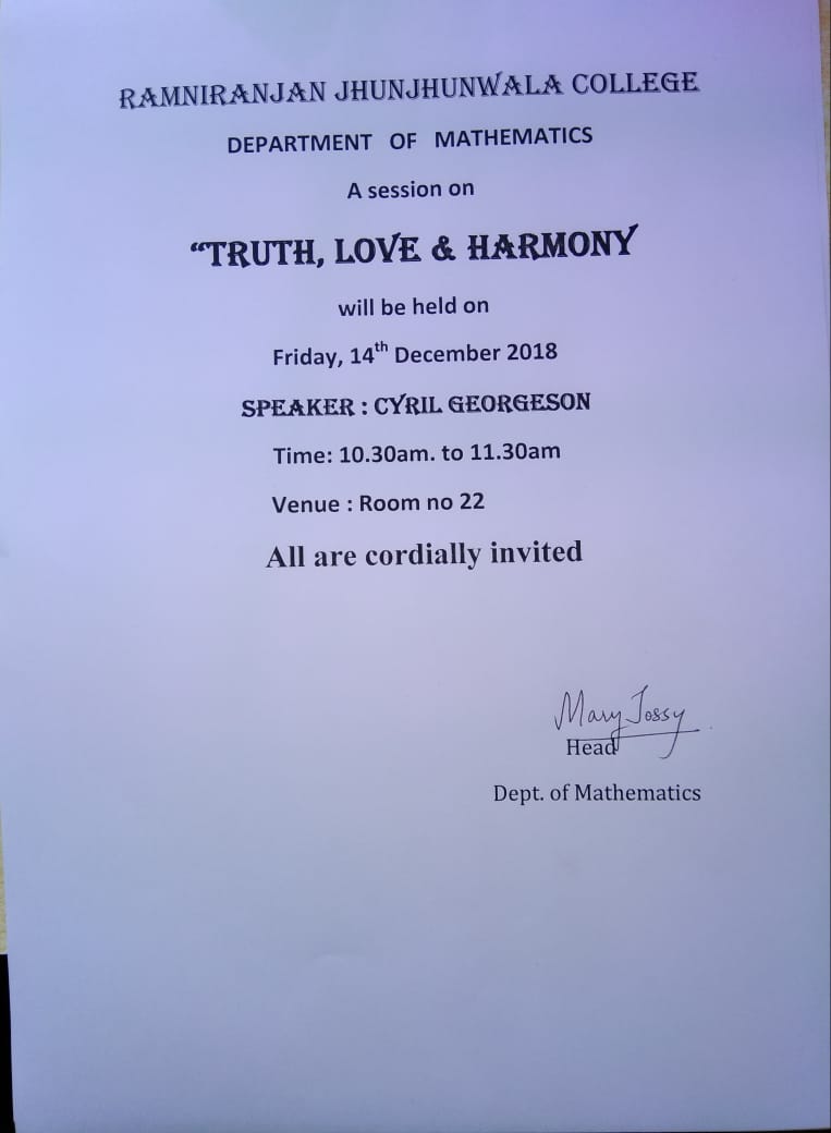 Session on “Truth, Love & Harmony” by Dept. of Mathematics on 14th Dec, 2018