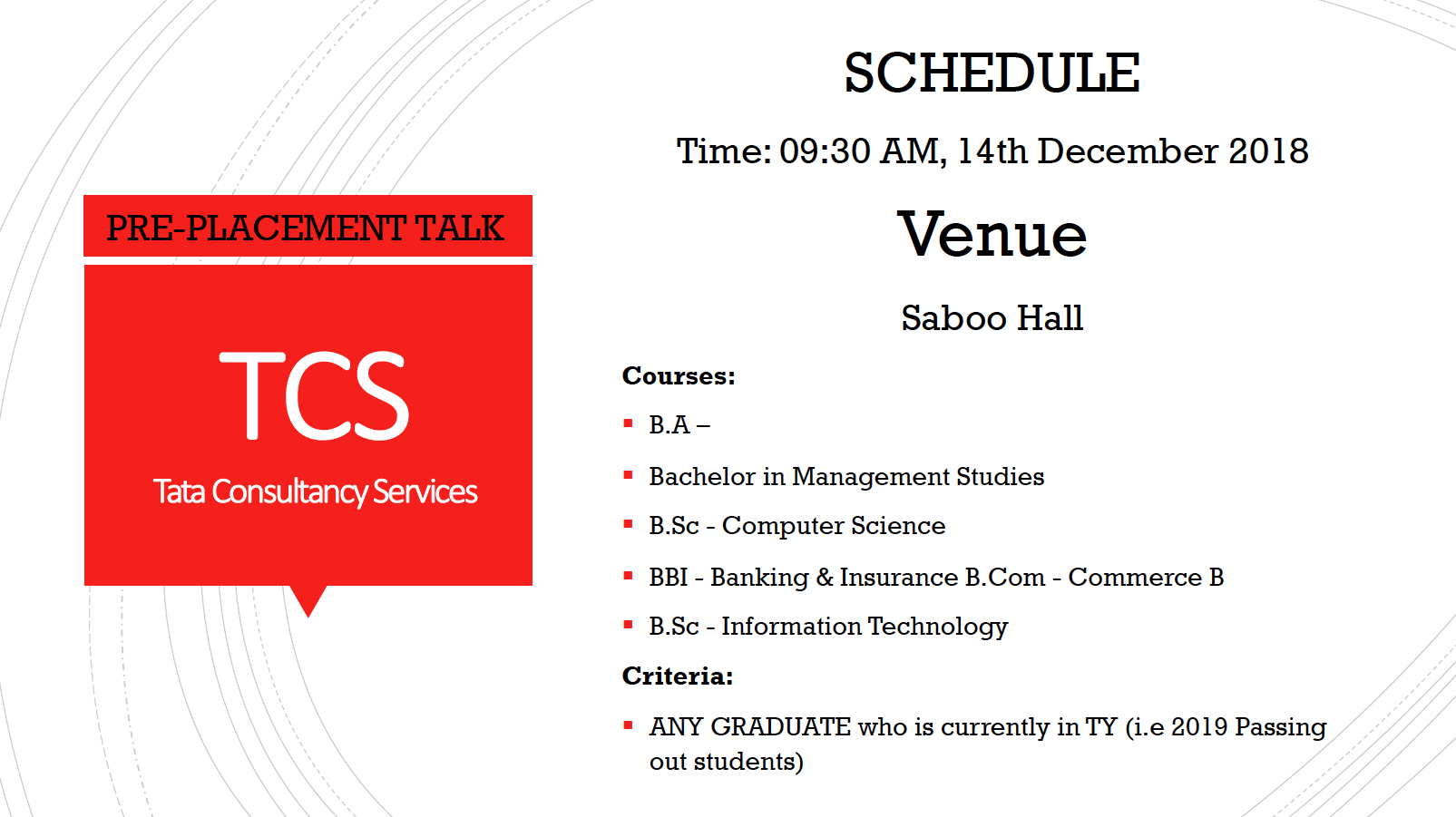 TCS Pre-Placement Talk on 14th Dec, 2018 at 9.30 am in Saboo Hall